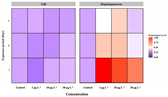 Heatmap of relative mRNA levels in the M. japonicus gill and hepatopancreas after exposure to 1, 10, and 30 µg L−1 irgarol on days 1, 4, and 7. The color schematically represents the up- or downregulation of AK expression.