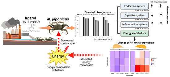 Shematic diagram of the effects of AK expression in M. japonicus gills and hepatopancreas after irgarol exposure. Create diagrams showing trends and effects of AK gene expression in M. japonicus exposed to irgarol based on current expression results. The irgarol-induced upregulation of AK gene disrupts energy metabolism, leading to an imbalance in intracellular homeostasis. This led to a decreased survival rate [10,27].