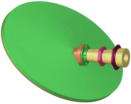 The model of the planar antenna to the bearing part is selected, as shown in Figure 4, and established as the finite element solid model for topology optimization. Among them, the planar antenna uses tetrahedral solid elements, and the rest use hexahedral elements. The three degrees of freedom on the right side of the shaft are all constrained, and the screw connection is simulated with rigid elements. The green part of the planar antenna in the figure is the designable region of the planar antenna and the rest is the non-designable region. The relative density of each element in the designable domain forms the column vector of in Equation (1).