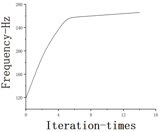The mathematical model in Section 1 is used for optimization, and after 14 iterations, the first-order frequency variation of the planar antenna is shown in Figure 5. As the number of iterations increases, the frequency increases continuously. It tends to level off after the sixth time with a maximum frequency of 265 Hz.