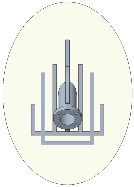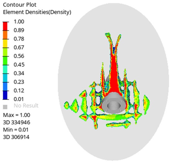 After the topology optimization calculation, the obtained results of the planar antenna reinforcement material layout are shown in Figure 6. The topology optimization results show that the reinforcement layout in the upper and lower regions of the rotation axis is clearly visible. The red area of the reinforcement has a cell density of 1, which is the area to be retained, and the blue area has a cell density of 0, which is the non-retained area. The topology optimization results show that the reinforcements are arranged in a “palm” shape along the center. The part of the planar antenna above the shaft is similar to the structure of the cantilever beam, which is farther away from the shaft, and the distribution of the reinforcement is extended from the shaft to the upper part, which is more in line with the structural rigidity requirements.