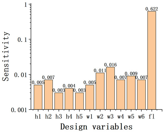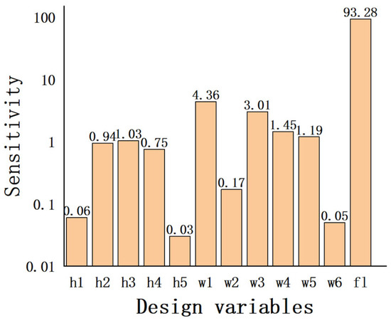 After the sensitivity analysis calculation, the sensitivity results of the design variables are finally obtained. The sensitivity analysis results of each design variable on the moment of inertia are shown in Figure 9 and the sensitivity analysis results of the frequency are shown in Figure 10. The variable fl denotes the thickness of the base plate, which is a design variable. As can be seen from the sensitivity analysis results, the thickness of the base plate has the greatest influence on the moment of inertia and frequency, and the influence of the remaining variables on the moment of inertia and frequency is slightly lower; however, each variable is very important, and the combined influence will be larger.