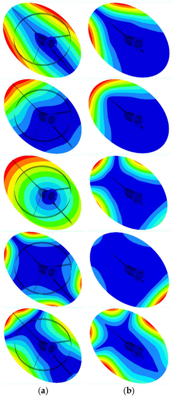 As shown in Figure 13 below, the left column shows the first- to fifth-order vibration patterns of the original structure, and the right column shows the first- through to fifth-order vibration patterns of the new structure. The red area represents the vibrating region of the structure, while the blue area represents the non-vibrating region of the structure.