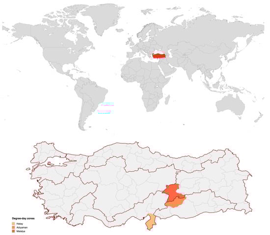 Two earthquakes struck Turkey on 6 February 2023. A total of 10 provinces have rebuilt their residences. In accordance with Turkish Standards 825, these provinces are classified into three climate zones. Hatay and Adana are in the first-degree day zone, while Adıyaman, Diyarbakır, Gaziantep, Kahramanmaraş, Kilis, Şanlıurfa, and Osmaniye are in the second-degree zone. Malatya is a third-degree day zone. This research identifies optimum insulation thickness for rebuilding efforts in these regions. The location of Turkey and the provinces affected by the earthquake discussed in the study are given in Figure 1.