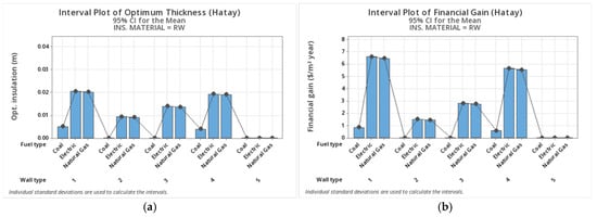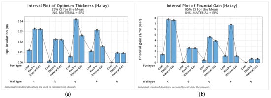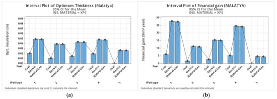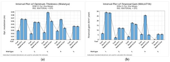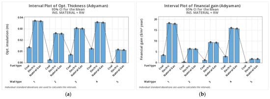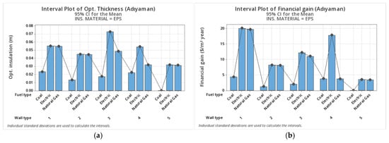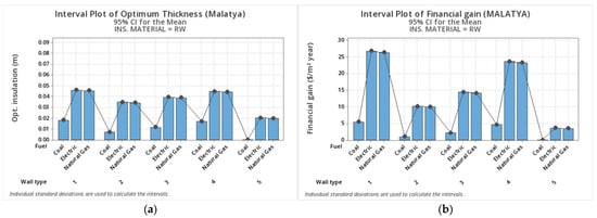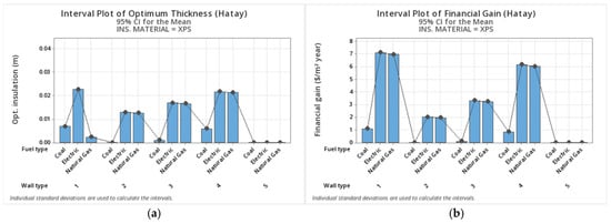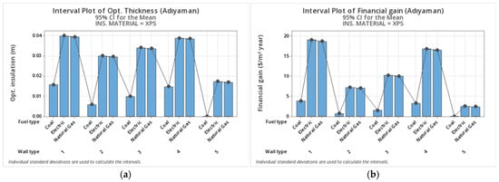 In the study, three distinct fuel types were selected for analysis: natural gas, electricity, and coal. Liquid fuels were not included due to their negative environmental impacts. Natural gas and electricity were chosen as they are the most suitable fuels for supporting the transition to green energy. Coal was selected because it is readily available in Turkey, despite its environmental drawbacks. Optimum insulation thicknesses and financial gains for 45 different situations (5 wall types × 3 fuel types × 3 insulation materials) for each city are calculated and compared with each other. Minitab V22.1 program, a statistical software, was used to compare the calculations made for a total of 135 different situations. To take into account uncertainties, interval plots drawn according to 95% confidence intervals are used.