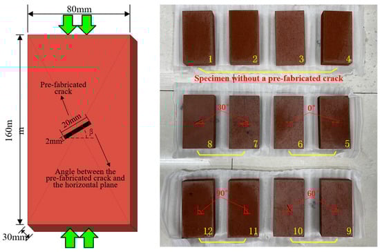The specimens were prepared strictly in accordance with the test regulations of the rock’s physical and mechanical properties. First, red sandstone was collected and processed into experimental specimens, each with a size of 80 mm × 30 mm × 160 mm. Next, cracks that each had a size of 20 mm × 2 mm and inclination angles of 0°, 30°, 60°, and 90° were prefabricated at the center of partial specimens, respectively. In addition, there were four samples without prefabricated cracks as the control group. Afterward, the surfaces of the specimens were polished until their roughness was less than 0.02 mm, and then random speckles were painted on the specimens (Figure 1).