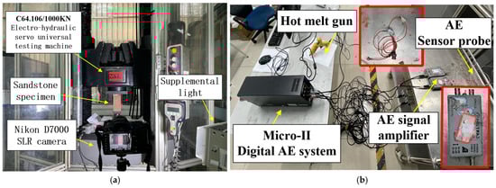 Experimental equipment for the rock specimens: (a) loading system and DIC monitoring system and (b) AE monitoring system.