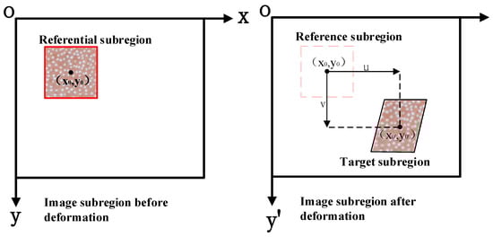 Because the speckles were randomly distributed on the red sandstone’s surface, the subregion centered at any point in the speckle field could be taken as an information carrier for the deformation and displacement change of the point. The displacement and deformation information at this point could be obtained by measuring and analyzing the deformation change in the subregion [17,18]. It was assumed that A(x0, y0) was the center of a subregion D on the surface of the measured object before it was deformed and that the size of the subregion D was m × n pixels. With these assumptions, the correlation search could be employed to find the target subregion D’ centered at A’(x’0, y’0); this was most relevant to subregion D in the image after this object was deformed. The displacement change at Point a can be defined as u = x’0 − x0, v = y’0 − y0, and the actual displacement at Point a was obtained by converting pixel units (Figure 3).