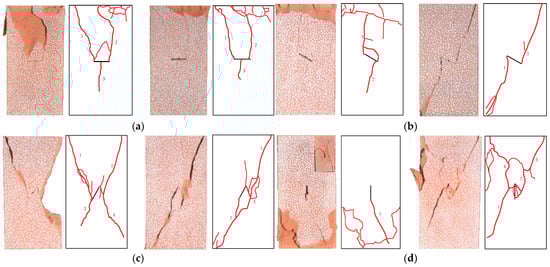 Macroscopic failure modes of the fractured red sandstone specimens can be determined by observing their failure results (Figure 4). Even though physical and mechanical information, including initial location, morphology, and the opening of macro-cracks, was obtained, it is still not convincing enough to investigate the expansion process of cracks and the evolution law of red sandstone failure only by this information. Therefore, the DIC method and the AE technology were adopted for more in-depth research and analysis of the strain field on the specimen’s surface and the expansion characteristics and evolution law of the internal micro-cracks [19,20,21].