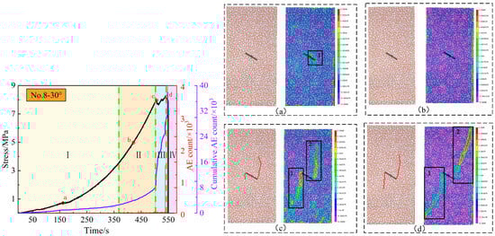 Uniaxial compression experiments were performed on red sandstone specimens with 30° and 60° prefabricated cracks, and the DIC–AE information obtained during the experiments is illustrated from Figure 5, Figure 6, Figure 7 and Figure 8. Taking the specimen with a 30° prefabricated crack as an example, the deformation and failure process can be analyzed in four stages, namely, the crack closure stage I, the linear elastic deformation stage II, the crack expansion stage III, and the post-peak failure stage IV.