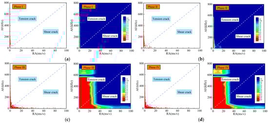 In the post-peak failure stage IV, the stress curve falls sharply. After the load stress reaches the peak strength of the specimen, severe macroscopic deformation occurs promptly, the deformation ends after the formation of the main fracture’s surface, and the specimen rapidly loses its bearing capacity, leaving no obvious residual strength. Additionally, the AE count is small, and the cumulative AE count peaks at around the peak intensity. Few low RA–high AF AE signals and some high RA–low AF AE signals were acquired.