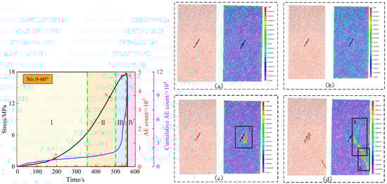 In crack expansion stage III, the stress curve fluctuates violently, lasts for a short period, and eventually reaches the specimen’s peak stress. Massive micro-cracks emerge, develop, and expand continuously in the specimen, finally forming penetrating cracks until macro-cracks can be observed. Meanwhile, the AE count becomes frequent with several extremely large values, the cumulative AE count surges accordingly, and many low RA–high AF AE signals and some high RA–low AF AE signals are detected. At Point c, obvious macroscopic cracks have formed on the surface of the specimen, which expand upward and downward from the upper and lower ends of the prefabricated crack, respectively. According to strain distribution in Region 1 and Region 2 in the cloud image, it can be inferred that the two macroscopic cracks will eventually develop into a large, penetrating crack spreading to the corners. At Point d, there are only two macro-cracks that expand upward and downward from the two ends of the prefabricated crack, respectively. However, unlike the image of Point c, the lengths and openings of the macro-cracks at Point d are noticeably larger. It can be observed from the strain cloud image at Point d that the macro-cracks will eventually develop into macroscopic penetrating cracks that extend from the two ends of the prefabricated cracks to the corners.