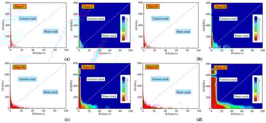 Four AE sensors were respectively installed on the back and side of the sample. No sensor was installed directly in front to avoid errors in image acquisition. At the beginning of the experiment, stress, AE signals and images were collected at the same time, which were used for subsequent multi-source information fusion analysis. Moreover, the kernel density estimation (KDE) method was used to identify the density regions that formed, based on the AE parameters. For a detailed introduction of the KDE method, refer to the author’s previous work [16]. The rise angle (RA) and average frequency (AF) are two important parameters in the KDE method.