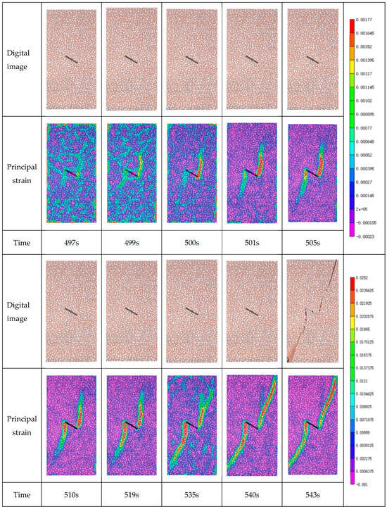 Figure 10 shows the principal strain obtained by the DIC method during the formation, expansion, and connection of macro-cracks on the surface of the red sandstone specimen with a prefabricated 60° crack. The failure spread along the upper right end of the prefabricated crack to the strain concentration areas at the upper right and lower right corners of the specimen, respectively, and the overall strain field distribution was x-shaped.