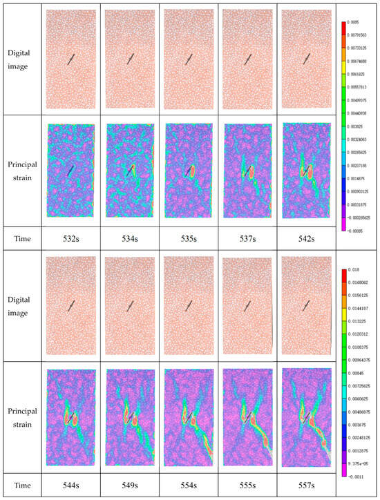 At Point a, a large strain began to appear at 535 s, and the formed crack expanded continuously within 535–549 s. Because the crack that did not expand sufficiently was compacted and squeezed at 549 s and the stress reached its peak at 555 s, a large macroscopic change occurred at Point a at 554 s when the strain curve ended. At Points c and e, the principal strain started to grow slowly and gently at around 535 s, and this trend continued until the final macroscopic failure of the specimen. This demonstrates that the crack, which emerged at Point a (left end of the prefabricated crack), gradually developed and expanded along the a–c–e path.