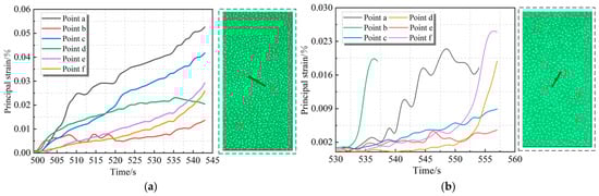 In Figure 11a, for the specimen with a 30° prefabricated crack, the principal strain curve at Point a rose more sharply from 501–510 s as compared with those of the other monitoring points, which is attributed to the emergence of a macro-crack at the corresponding time, according to the digital images and principal strain cloud images in Figure 9. From 501–543 s, this macro-crack emerged at Point a and then developed and expanded along the a–c–e path into a large penetrating crack.