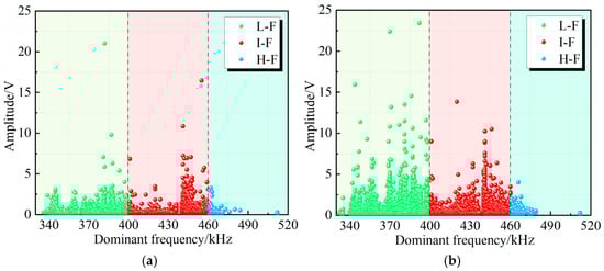 Band classification of the dominant frequency for red sandstone specimens with prefabricated cracks: (a) No. 8–30° and (b) No. 9–60°.