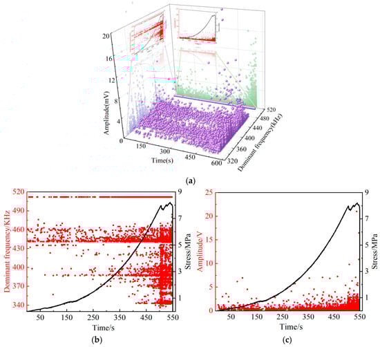 Distribution of AE time-dependent dominant frequencies and amplitudes in red sandstone specimens with a 30° prefabricated crack: (a) dominant frequencies, (b) amplitude, and (c) 3D distribution points.