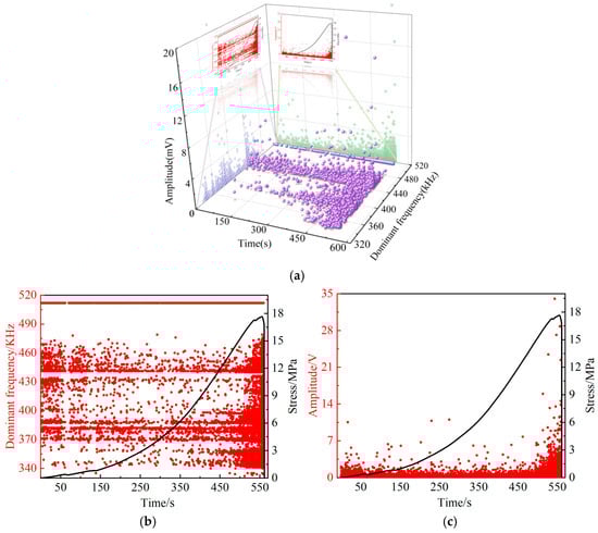 Distribution of AE time-dependent dominant frequencies and amplitudes in red sandstone specimens with a 60° prefabricated crack: (a) dominant frequencies, (b) amplitude, and (c) 3D distribution points.