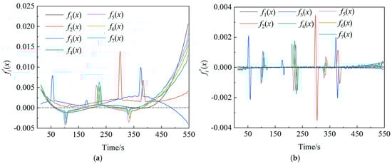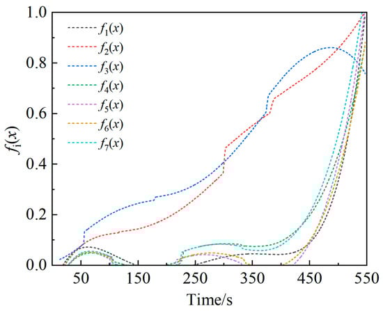 The parameters of the fitting function for the seven multi-source information indexes are listed in Table 2, where R2 characterizes the fitting degree of the fitting function. The closer the value of R2 is to 1, the higher the fitting degree is. In Table 2, the R2 values of f1(x) − f7(x) are 0.9869, 0.9954, 0.9415, 0.9749, 0.9108, 0.9358, and 0.9693, respectively, indicating that the polynomial function has an ideal fitting degree.