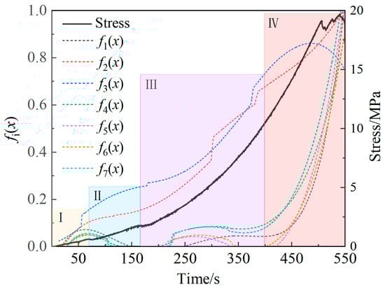 During the loading and failure processes of red sandstone specimens, the fitting function values of the multi-source information change nonlinearly (Figure 16). By comparing the stress–strain curves and the multi-source information function curves during the failure process, it was found that the points at which the concavity and monotonicity of the multi-source information function curves change may be the dividing points between different failure stages.