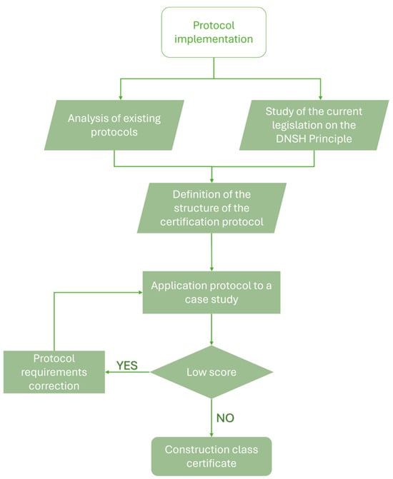 The so-called emission contribution deriving from construction activities comes from the engines of work vehicles, from processes that include earth moving (raising of dust) and the movement of the means of work. Also, in this case, the construction sector is one of the most impactful: it is estimated that before the pandemic, according to the sources of the World Green Building Council, buildings and the construction sector were responsible for 39% of all global carbon dioxide emissions, of which 11% were associated with the construction process []. With regard to the latter, carbon dioxide emissions deriving from the engine and movement of the means used for waste management are a difficult problem to manage when aiming to provide a positive contribution to the reduction of air pollution and at the same time to the mitigation of climate change []. Construction sites are responsible also for 14.5% of PM 2.5 emissions and 8% of PM10 emissions. The research aims to fill some gaps in environmental sustainability protocols that concern the construction site, as the most polluting moment in the life cycle of the building. In light of this, research has focused precisely on the construction process, through the development of a certification protocol in order to concentrate all the analysis of the existing literature and the aspects to be monitored during the construction site into a single protocol. The aim of the protocol is to certify the compliance of the construction process with the DNSH principle with a series of prerequisites and requirements to which a weighted score has been assigned. The fundamental criticality that this protocol aims to resolve is the absolute lack of a systematized process to refer to in order to verify compliance with the DNSH principle, which is currently entrusted to checklists drawn up at the discretion of the designer or construction company.