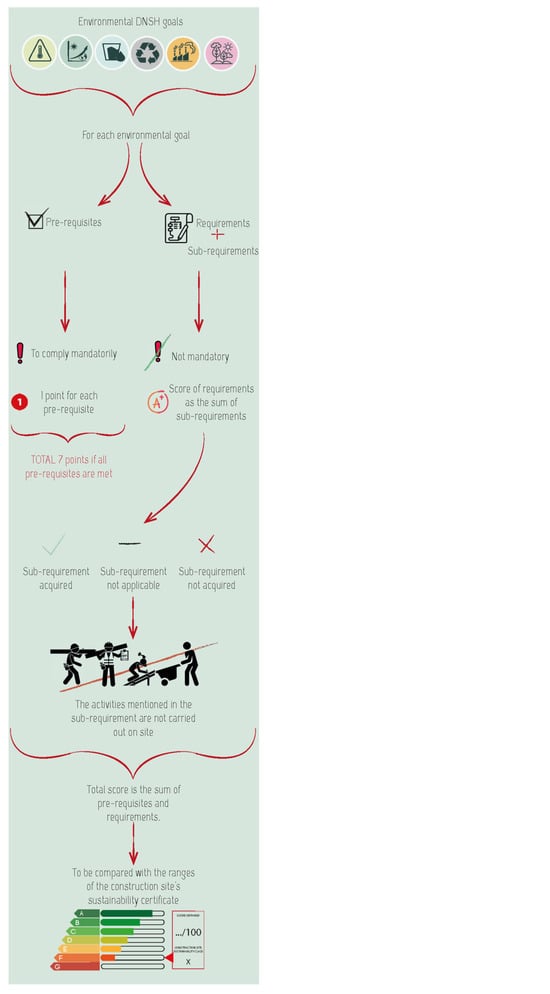 The certification protocol is structured through a series of prerequisites and requirements to which a weighted score has been assigned, deduced from the existing regulatory obligations regarding the DNSH principle and the current environmental legislation, as well as from the indications provided by the guidelines on environmental management of the construction site [] of the rating and certification systems. The choice of the themes adopted to structure the protocol is a direct consequence of the analysis of Regulation 2020/852, which defines six environmental objectives that have been included within the method and treated as if they were macro-categories to which the requirements themselves can be traced back. The method used to assign the scores derives from the study of state-of-the-art examples and the complexity of the individual themes covered, and it assigns a higher score to the macro-categories with greater value and a lower score to the macro-categories with less importance for the specific area of the construction site. The complexity of the construction site activities did not allow for the evaluation of each individual aspect of the aforementioned environmental objectives in a meticulous and analytical manner; However, it is possible to summarise the salient aspects of the protocol: