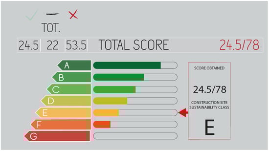 In order to validate the method of application of the certificate, it was necessary to perform an analysis of the traditional construction site according to the principles stated and then proceed to its evaluation by hypothesising its development according to the principles of sustainability. Following an analysis of the current state of the construction site, according to the macro-categories indicated previously, the prerequisites of the same were analysed by assigning to each element, correlated to the DNSH principles, a sustainability score of the construction site. The total acquired by the construction site, according to the traditional structure, led to obtaining a score of 24.5/78. The score obtained corresponds to the Sustainability Class “E” which does not allow certification of compliance with the DNSH principle (Figure 6).