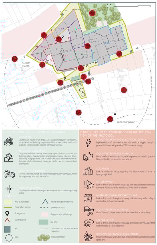 Through the application of the protocol, the most critical issues characterising the study site emerged. The critical issues identified and highlighted by the protocol are listed below:—Construction site electricity supply: the supplier does not guarantee 100% renewable energy;—Construction site mobility: The road and non-road work vehicles are diesel or petrol-powered;—Location: Location in the historic centre;—Water saving: lack of devices and strategies necessary for the reuse of uncontaminated rainwater and lack of construction site water monitoring;—Waste recovery and recycling: lack of devices and strategies for the recovery and recycling of construction and demolition waste;—Building materials: use of “classic” construction materials for the renovation of the building;—Air pollution: lack of devices and strategies necessary for monitoring PM10 and PM2.5 dust emissions into the atmosphere [];—Removal of invasive vegetation: presence of invasive vegetation that hinders the progress of construction operations.