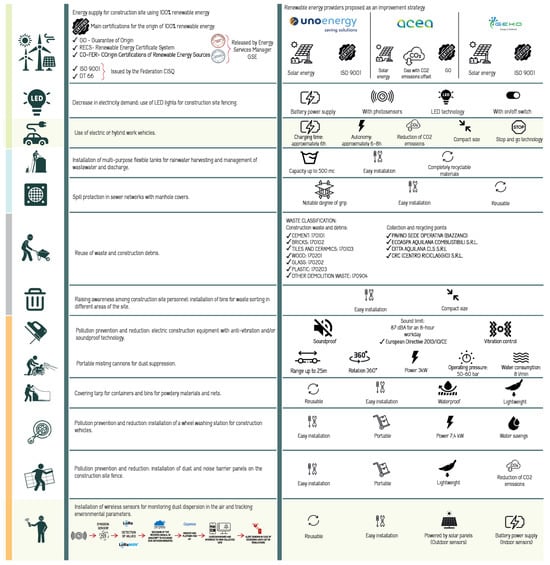Following the application of the protocol and the analysis of the critical issues found, the research focused on the definition of improvement design strategies, in order to increase the level of sustainability of the construction process of the building site [,] and finally respect the DNSH principle. These strategies were formulated based on the analysis of the current state and the nature of the work carried out on the building site, as well as on the basis of the objectives that could actually be pursued by the building site itself. Ultimately, an attempt was made to introduce strategies that would allow the building site to contribute substantially to the improvement of each environmental objective, both through strategies that include the introduction of devices that assist the construction process itself, and through actual actions to be carried out within pre-established times. Figure 8 shows the improvement strategies defined for the building site in tabular form, each of which includes the use of specific solutions relating to the six criteria of the DNSH principles mentioned.