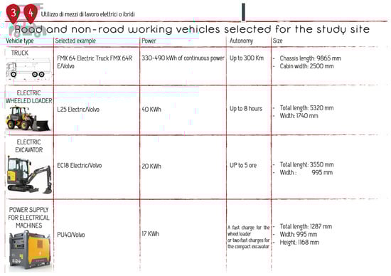 In Figure 9 a summary table of construction site vehicles is provided, reporting the brand of the vehicle chosen as an example and some of its characteristics: