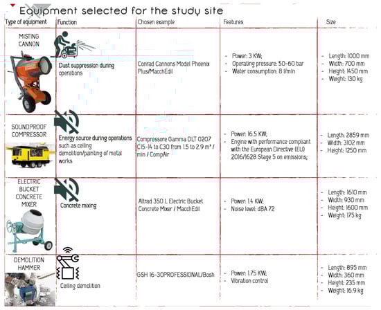 Below is a summary table with the main equipment chosen for the work carried out in the study site (Figure 10).