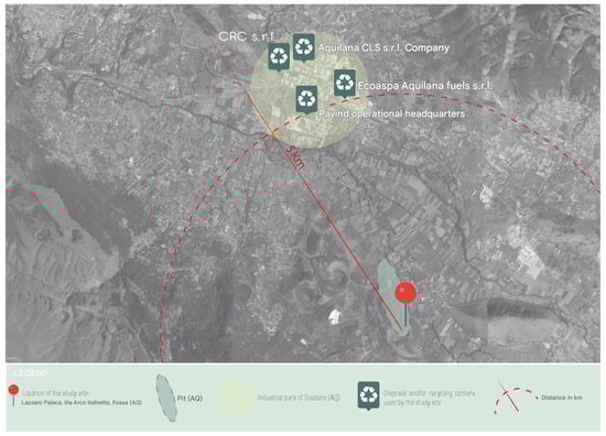 In order to calculate the number of trips and the length in Km of each of them, research was carried out on the recycling and sorting centres used by the study site, and the distance in Km of each of them from the site itself was determined. A summary table is reported below (Figure 11 and Figure 12). The site https://www.maceriesisma2009.it/ (accessed on 15 January 2025) was subsequently consulted, which is a portal where it is possible to monitor in real time the quantity and type of rubble produced by the reconstruction sites following the earthquake of April 6, 2009. The data are related to both public and private rubble. On the portal, it is also possible to observe the places where the rubble is disposed of daily and the type of vehicles used to transport it. Research was therefore carried out on Palazzo Lazzaro and it was possible to determine the Y and Z factors. An explanatory table is reported containing the quantity and type of waste produced and the number of trips made to each waste recycling and sorting point (Figure 11 and Figure 12).