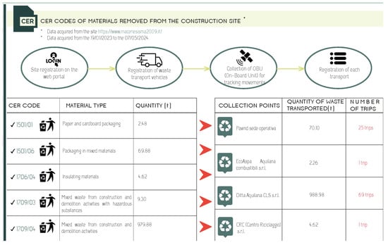 Data acquisition method, type and quantity of waste produced by the construction site and collection points and relative number of trips made. (Data acquired from 19 January 2023 to 7 May 2023).