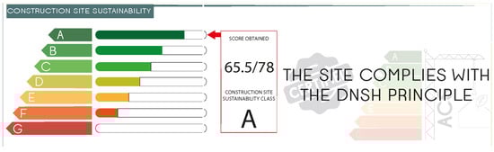 The DNSH principle is respected if the construction site is Class A, B or C, below the score of 50 points; it is necessary to introduce other mitigation strategies in order to increase the level of sustainability of the construction process. It is clear that, unlike the current method based on written self-certifications, the score protocol provides a valid document of clarification on whether or not the principle is respected.