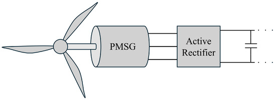 For PMSGs, it is common to utilize a rotating reference frame to model and control the machine. Following the power-invariant d/q transformation presented in [29], electromagnetic torque can be calculated as shown in (5), where p is the number of poles, is the rotor flux linkage, are the d-/q-axis stator inductances, and are the d-/q-axis stator currents. In this work, it is assumed that there are no losses in the PMSG, such that is equal to the torque applied on the shaft of the PMSG rotor.