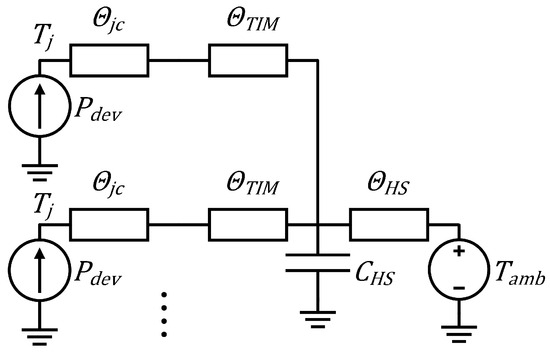 The simplified version of the Cauer network can be observed in Figure 4, where is defined as the per-device losses calculated using (12), represents the device junction-case thermal resistance, represents the thermal resistance of the TIM, represents the thermal capacitance of the heat sink common to each device, represents the thermal resistance of the heat sink, represents the temperature of the ambient temperature of the environment, and represents the junction temperature of the device.