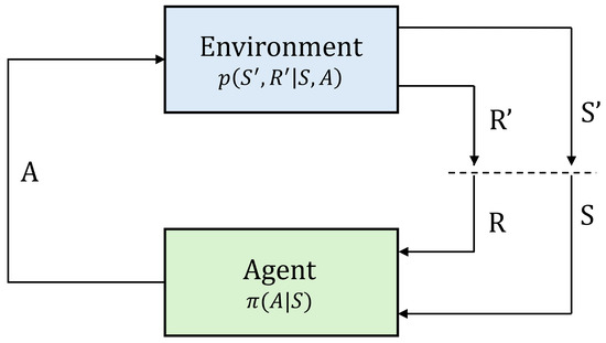 The RL framework can be defined by two discrete entities: the agent and the environment. The environment can be thought of as a means of responding to the action A taken by the agent by transitioning from the current state S to the next and providing the agent some reward R. In general, the purpose of the agent is to choose A to maximize R. These actions are taken following some policy , which is the core of the RL agent. The RL agent improves the quality of as it learns more about the dynamics of the environment. These policy improvements can be conducted in several ways, giving rise to a number of RL methods, such as temporal difference (TD)-learning, actor–critic methods, and deep-deterministic policy gradient methods, to name a few. Please refer to [37] for more information. A general block diagram portraying the RL framework is shown in Figure 5.