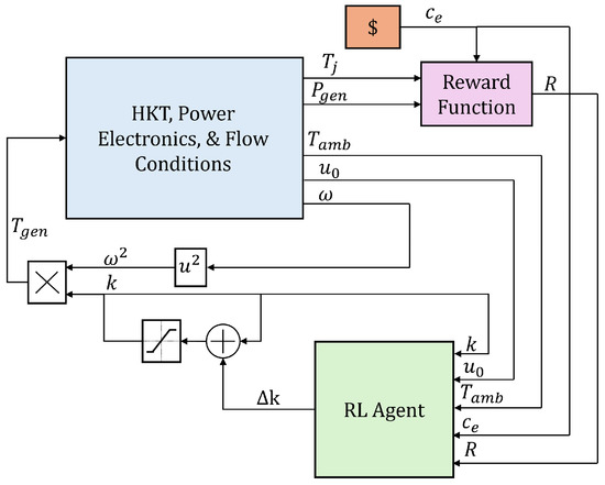 This work develops a model-free approach that reduces the thermal stresses on a device through a lightweight stochastic gradient descent (SGD) state–action–reward–state–action (SARSA) algorithm with a Gaussian radial basis function (RBF)-based approximation method, similar to the method presented in [25]. The proposed RL method in this work is built within a common k-omega-squared (or optimal torque controller [11,12]), thereby removing the need for a complex actively controlled thermal management system. Also, this work utilizes a similar economic-based reward function to that developed in [15] to train the RL agent. The work presented in [25] was primarily focused on maximizing energy generation with the consideration of environmental impacts on HKT performance through a linear feedback torque control law. Although the proposed RL method is similar, the state space in this work is significantly more complex (considering not only the flow velocity but also the water temperature, energy cost, and current feedback gain k), leading to additional challenges in designing the RL method and thoroughly training the RL agent.