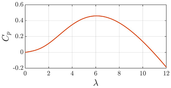 The HKT system in this work is derived from the work presented by Bahaj et al., which is a three-bladed horizontal axis turbine with a rotor diameter of 0.88 m [42]. For this example HKT system, the rotor dimensions have been linearly scaled from the dimensions presented in [42] to reach 6 kW at a flow velocity of 2.25 m/s, resulting in a blade radius of 0.8538 m. The versus curve derived from the results presented by Bahaj et al. is presented in Figure 7. A summary of all HKT parameters is shown in Table 1.