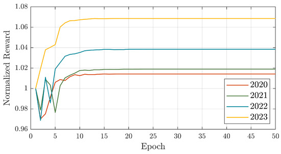 During the training protocol, the RL agent converged to a policy within 15 epochs, which led to an improvement in terms of reward for all four training years. The results for 2023 found the largest benefit during the proposed training, with significantly higher increases in rewards and a much more consistent reward profile. The RL agent’s strong performance during the 2023 training sessions is just one example of how the cost of energy or the LMP profile influences its learning ability. As shown, the reward impacts are directly related to the average cost of energy each year: the lower the energy costs, the lower the total reward accumulated by the RL agent.
