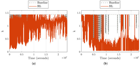 Figure 14 shows the accumulation of energy harvested by the turbine () while using both control schemes. As shown, the RL-based controller under-performs compared to the baseline in this category. Considering the nature of the proposed RL method, this outcome is expected as any deviation from the optimal value of k will lead to lower values of , which, in turn, reduces . However, the impacts on varied quite significantly between the two years. In a side-by-side comparison, the RL method reduced the annual energy harvested by 5.8% and 25.2% in 2019 and 2024, respectively, when compared to the baseline. Referring to the k profiles in Figure 11, this difference in energy generation can be explained by the large difference in applied values of k between the two years. In 2024, the applied values of k are significantly lower, yielding both higher rotational speeds and values of that stray further from the optimal point, resulting in values of that are much lower than the maximum.