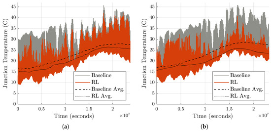 Considering that the dynamics of the HKT system can vary over time, adaptive model-free control methods are increasingly attractive. Reinforcement learning (RL) is a model-free learning-based approach that develops its own understanding of the system by interacting with its environment. RL has shown promise in applications of condition monitoring, fault diagnosis, and remaining useful life estimation for power electronic converters [19] and has been used to maximize the energy generated by HKT systems in various applications [20,21,22,23,24,25]. However, few works have been published that utilize RL to extend the lifetime of power electronic converters. References [26,27] present a neural-network-based approach to predict the driving behaviors and device junction temperature for a given point-to-point trip in electric vehicle applications. The predicted temperature profile is then used alongside a rainflow counting algorithm that identifies the most harmful thermal cycles the devices may face over the drive cycle and creates a reference junction temperature at or near the peak value of the thermal cycle to reduce junction temperature fluctuation. This reference temperature is then used to control the cooling system employed in the vehicle, which requires a complex and highly capable cooling system that is not suitable for most HKT applications.