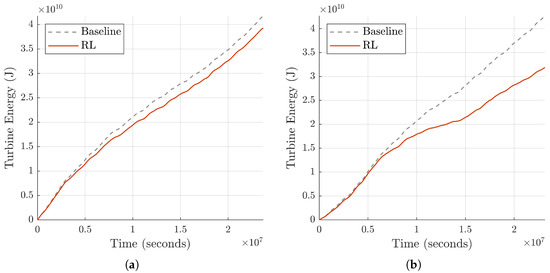 Energy harvested by the turbine () using both the baseline and RL-based control schemes for the (a) 2019 case study and (b) 2024 case study.