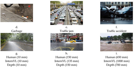 | 2 | LIGHT GREEN | Garbage Traffic jam Flooding (10 mm < depth ≤ 150 mm) | The presence of traffic congestion, garbage accumulation, and minor flooding (10 mm < depth ≤ 150 mm) has a negligible impact on vehicular traffic. |