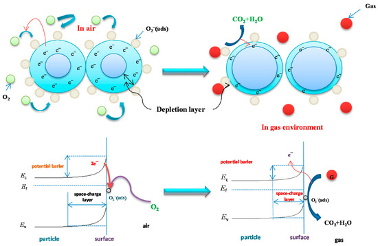 Schematic diagram of the sensing mechanism of n-type semiconducting metal oxide nanostructures for reducing gas (reproduced from [36], MDPI, 2020).
