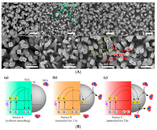 (A) FE-SEM images of the gas sensors are shown. (a,b) are the results of the hydrothermal synthesis. (c,d) are TiO2 NRs and Pt NPs of Sensor A. (e,f) are TiO2 NRs and Pt NPs of Sensor B. (g,h) are TiO2 NRs and Pt NPs of Sensor C. The inset in (f) shows an enlarged image to clearly display the Pt NPs on the TiO2 NRs. The red arrows indicate Pt NPs. The green arrows in (c) indicate chunks of Pt agglomerated together on the top surface of TiO2 NRs. (B) Proposed sensing mechanisms are depicted. Photoelectrochemical activities for sensing NO2 with respect to time of annealing TiO2 are shown. (a) is the schematic of Sensor A, which did not have an annealing process to TiO2. (b,c) suggest the working mechanisms of Sensor B and Sensor C, of which TiO2 NRs were annealed for 1 h and 2 h, respectively. e− and h+ indicate electron and hole, respectively (reproduced from [57], MDPI, 2021).