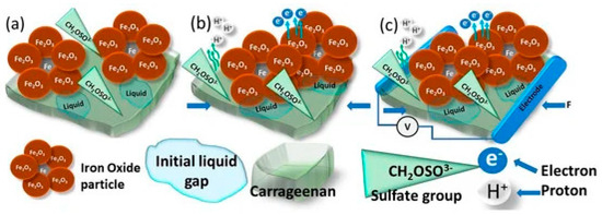 Visual representation of charge transfers in carrageenan film generated by applied force. (a) Visual representation of carrageenan film with iron (III) oxide particles; (b) charge generation in prepared film and the release of charge-carrying particles due to force; (c) visual representation of experiment scheme of film under short-term mechanical load (reproduced from [73], MDPI, 2024).