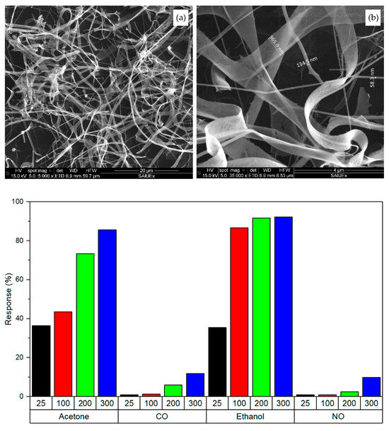 (top): SEM images of tin oxide nanofibers and nanoribbons doped with PG after calcination at 450 °C. (a) Low and (b) high magnifications. (bottom): Sensor responses to 2 ppm ethanol, 4 ppm acetone, 5 ppm CO, and 100 ppb NO at different operating temperatures (25, 100, 200, and 300 °C) (reproduced from [82], MDPI, 2020).