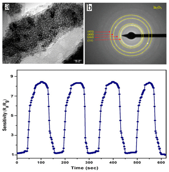 (top): (a) TEM images of the In2O3 thin film deposited at 500 °C. (b) SAED of the In2O3 thin film deposited at 500 °C. (bottom): Repeatability of indium oxide thin films sprayed at 500 °C toward 50 ppm toluene (reproduced from [92], ACS, 2021).
